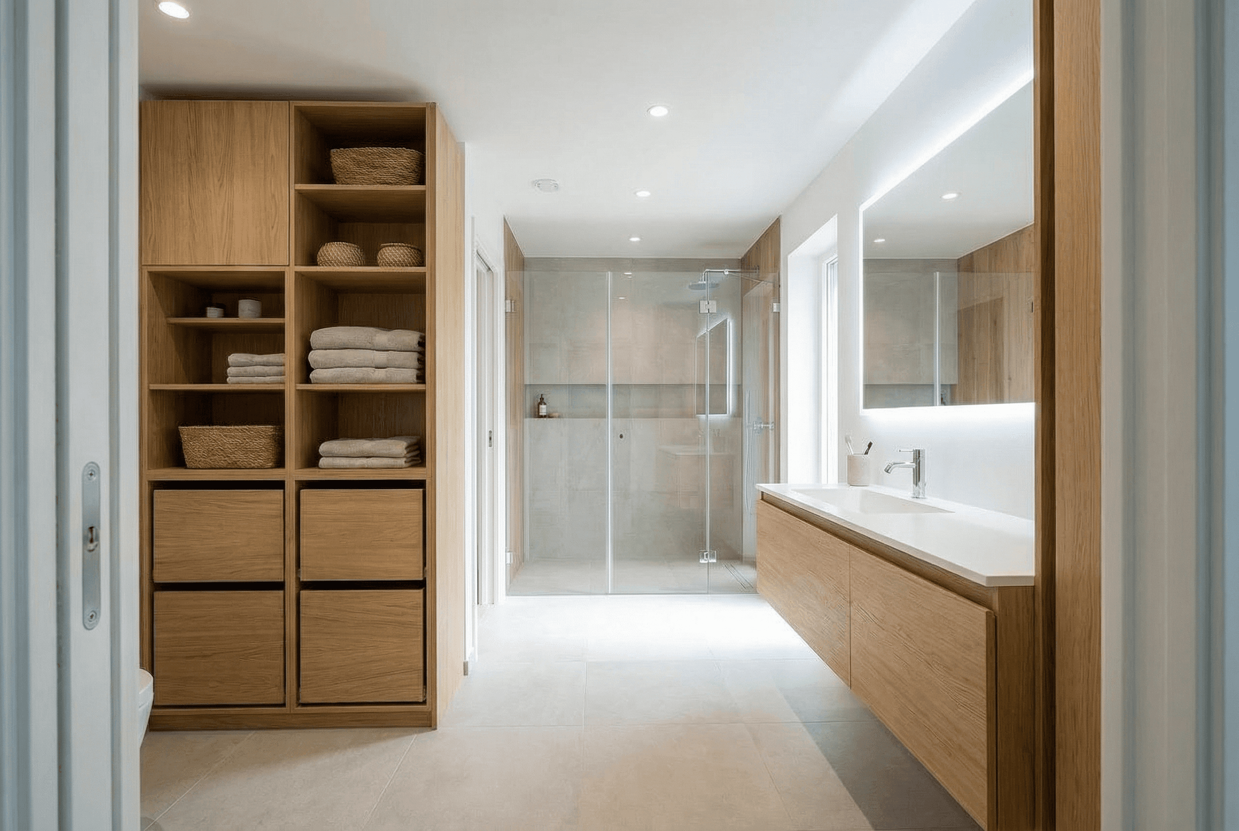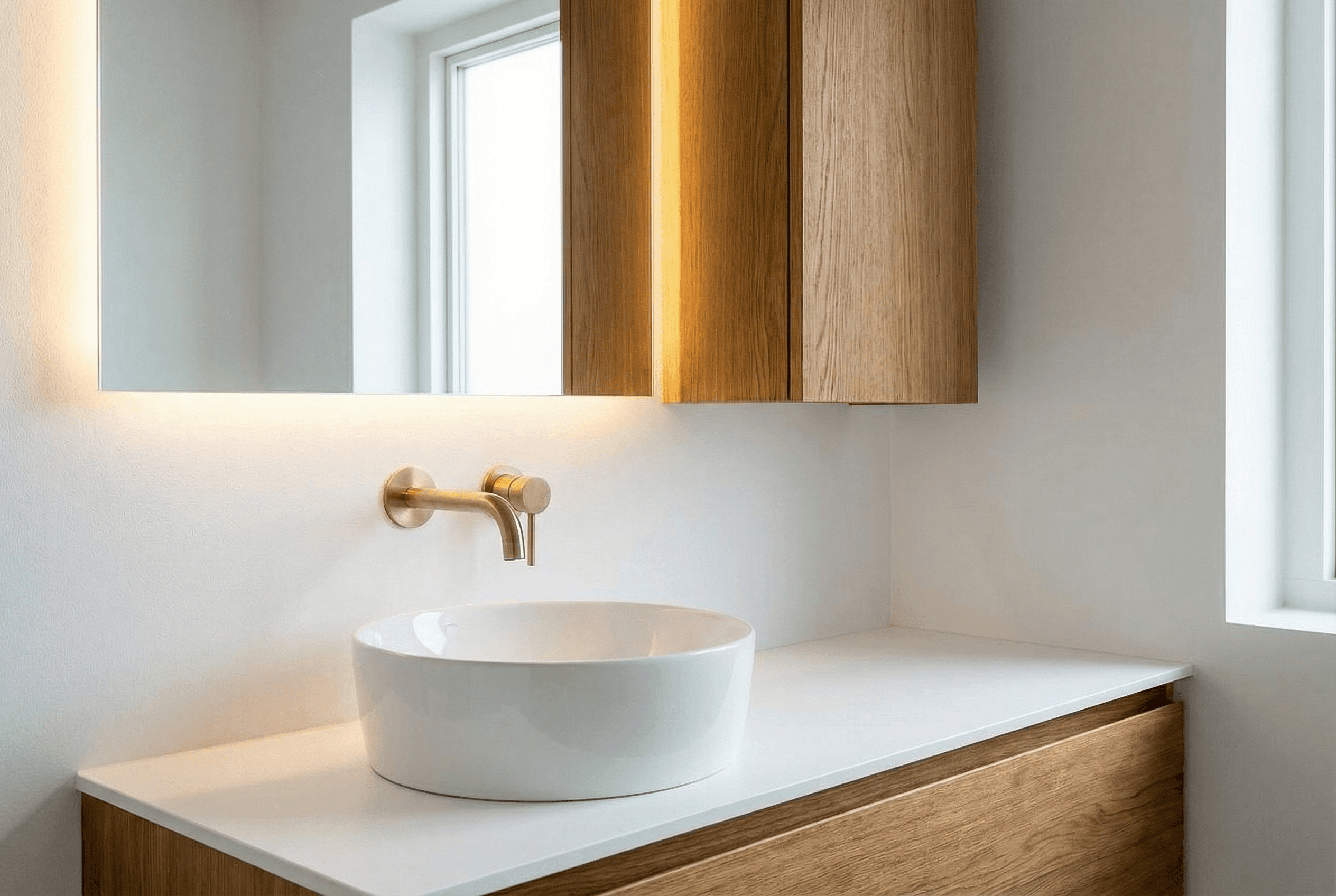 A space-optimized bathroom cabinetry project in Mission Viejo. The goal was to maximize storage in a compact space without compromising on style — delivering a clean, functional result that feels far larger than its footprint